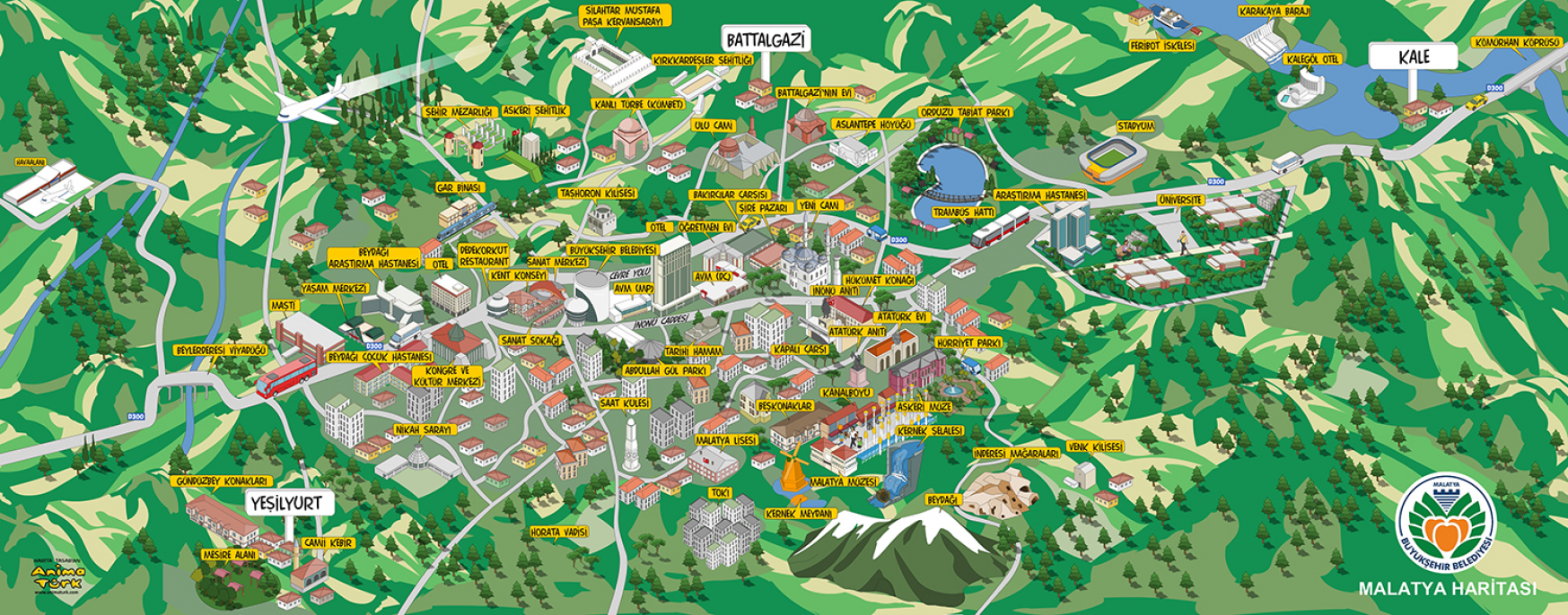 Malatya Merkez Battalgazi ve Yeşilyurt İlçelerinde bulunan tarihi ve turistik yerleri gösteren Turizm Haritası...